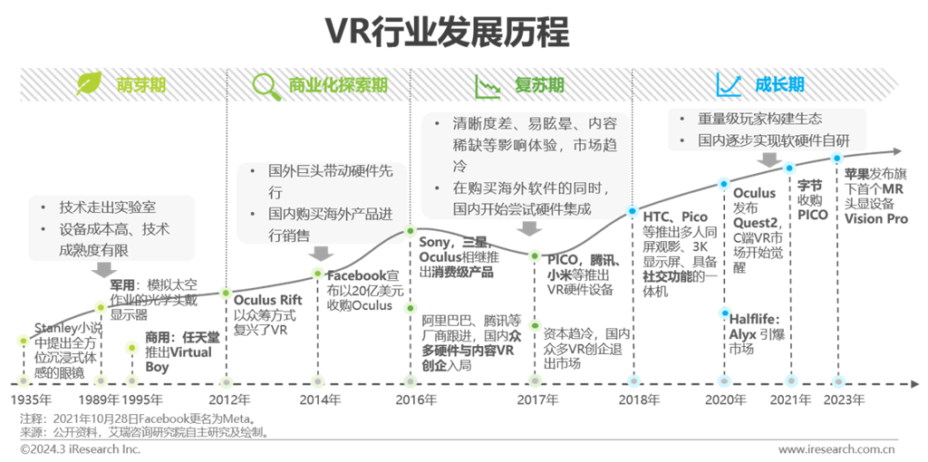 虛擬現(xiàn)實概念源于科幻小說,由任天堂等游戲廠商開啟商業(yè)化之路。早期設(shè)備成本高,技術(shù)成熟度有限,游戲廠商的嘗試都宣告失敗。2016年是虛擬現(xiàn)實的元年,硬件巨頭消費級產(chǎn)品的推出,疊加中國眾多VR創(chuàng)企大力進軍硬件端與內(nèi)容端,短期市場呈爆炸式增長。但行業(yè)整體處于民用初期,受內(nèi)容稀缺、設(shè)備易眩暈、屏幕清晰度差等影響,消費級市場整體發(fā)展放緩。伴隨行業(yè)技術(shù)日趨成熟與產(chǎn)業(yè)玩家的擴容,行業(yè)在2020-2022年邁入發(fā)展的關(guān)鍵階段,Quest銷量迎消費級拐點。2023年蘋果Vision Pro發(fā)布,其對全新交互方式的實踐為業(yè)內(nèi)玩家?guī)硇碌乃伎?。作為現(xiàn)階段頂配產(chǎn)品,Vision Pro的出現(xiàn)不僅極大拉動虛擬現(xiàn)實產(chǎn)業(yè)玩家信心,同時在市場激起的“浪花”,為行業(yè)帶來更多關(guān)注。艾瑞認為,在可預見的27~28年,蘋果二代甚至三代產(chǎn)品將貢獻下一個里程碑,為產(chǎn)業(yè)帶來新的爆發(fā)。