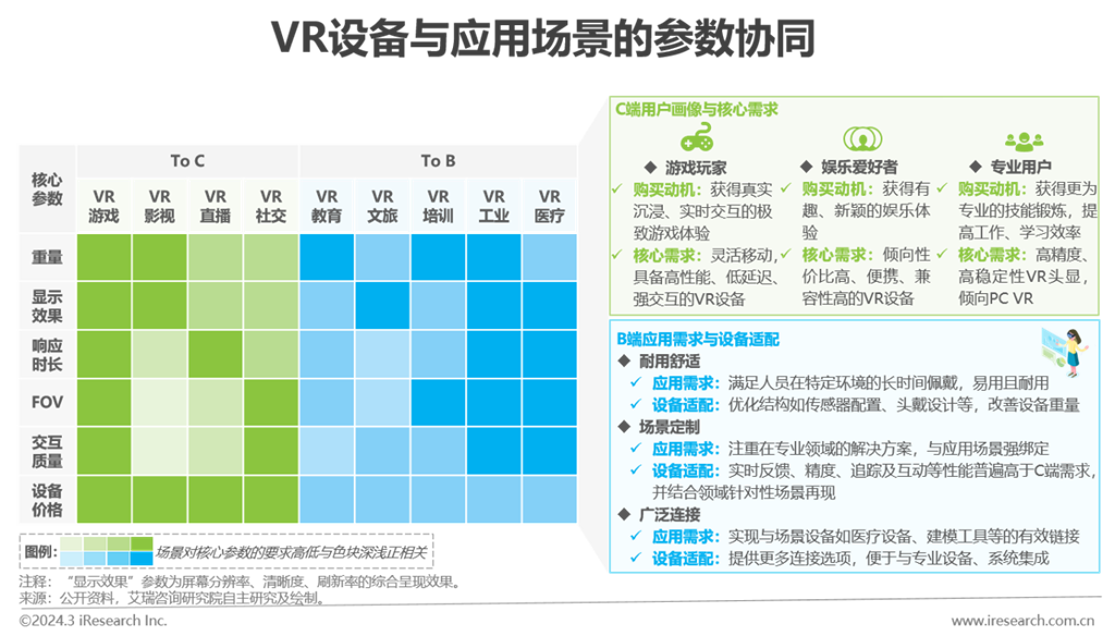對于消費級領(lǐng)域,游戲是VR在C端落地最早且相對成熟的場景,VR游戲用戶的行業(yè)教育程度最深,導致其對VR產(chǎn)品及服務的敏感性增強。行業(yè)后續(xù)衍生的C端場景中,直播、社交等聚焦動態(tài)與實時交互的細分應用對響應時長、交互質(zhì)量更為關(guān)注。VR影視更多依賴預先開發(fā)內(nèi)容,應用重點在于展示。對于行業(yè)級領(lǐng)域,工業(yè)、醫(yī)療等技術(shù)門檻高的場景較為關(guān)注VR設(shè)備的可操作性,因而與應用效果直接關(guān)聯(lián)的各項參數(shù),均為該場景的關(guān)注重點。在教育、培訓等場景,VR技術(shù)與產(chǎn)品的應用價值多體現(xiàn)為對行業(yè)工作模式的創(chuàng)新改革,領(lǐng)域用戶對VR技術(shù)、服務性能容忍度更高。