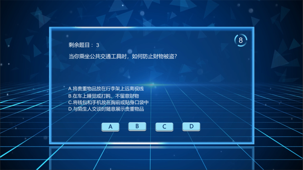 針對(duì)搶盜風(fēng)險(xiǎn),系統(tǒng)以互動(dòng)答題的形式模擬日常生活中可能遇到的搶劫、盜竊等突發(fā)情況。例如,在公共場所的休息區(qū),如何防止財(cái)物被盜,或在公共場所財(cái)物被盜等場景。用戶需要在模擬情境中選擇正確的應(yīng)對(duì)措施,系統(tǒng)會(huì)根據(jù)用戶的選擇提供實(shí)時(shí)反饋,幫助用戶學(xué)習(xí)如何冷靜應(yīng)對(duì),采取正確的自我保護(hù)措施。