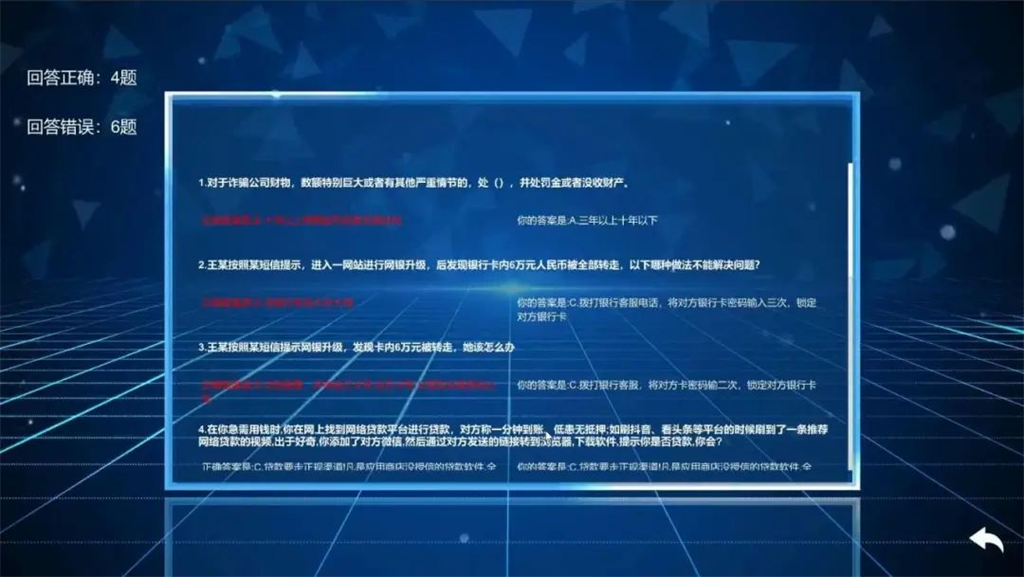 題目涵蓋當(dāng)前流行的詐騙方式,例如刷單詐騙、冒充微信、投資理財(cái),通過簡單的互動(dòng)答題提高預(yù)防意識(shí)。整個(gè)體驗(yàn)流程以互動(dòng)答題的形式展開,玩家需要從多個(gè)選項(xiàng)中選擇正確選項(xiàng),體驗(yàn)完系統(tǒng)會(huì)給出評(píng)分和實(shí)時(shí)反饋,幫助用戶識(shí)別詐騙套路。用戶不僅可以通過答題學(xué)習(xí)詳細(xì)的詐騙知識(shí),還能在互動(dòng)中掌握全面的防范措施和安全建議,例如如何保護(hù)個(gè)人信息、避免上當(dāng)受騙等。