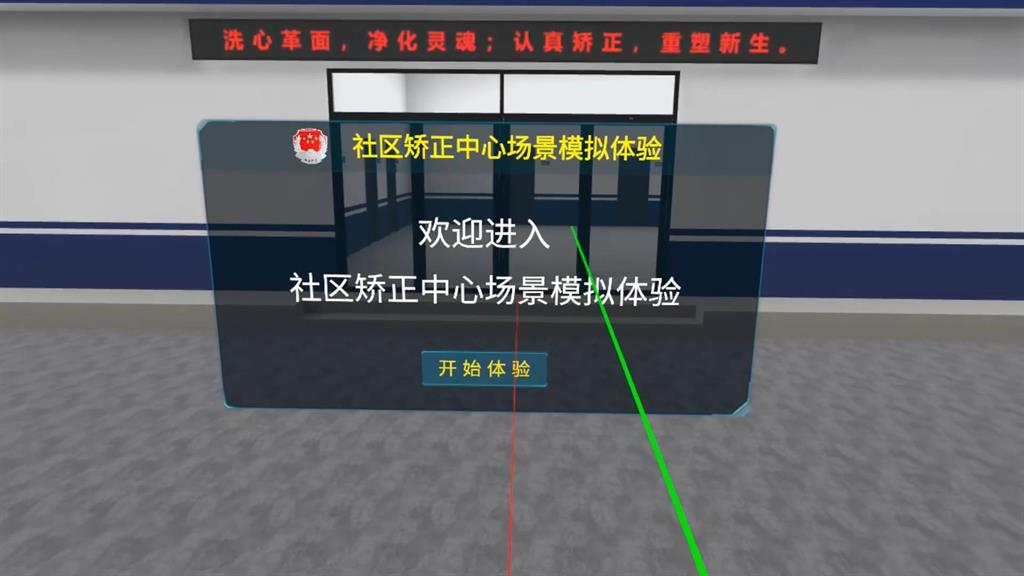進入VR場景,體驗者站在社區(qū)矯正中心大門前,點擊手柄即可進入內部。大廳內,系統(tǒng)語音隨即介紹中心的主要職責與區(qū)域劃分。隨后,體驗者可自由漫游至各功能室,系統(tǒng)會詳細介紹每室的功能及在社區(qū)矯正中的作用。此外,大廳還設有互動答題環(huán)節(jié),增強體驗趣味性與知識性。