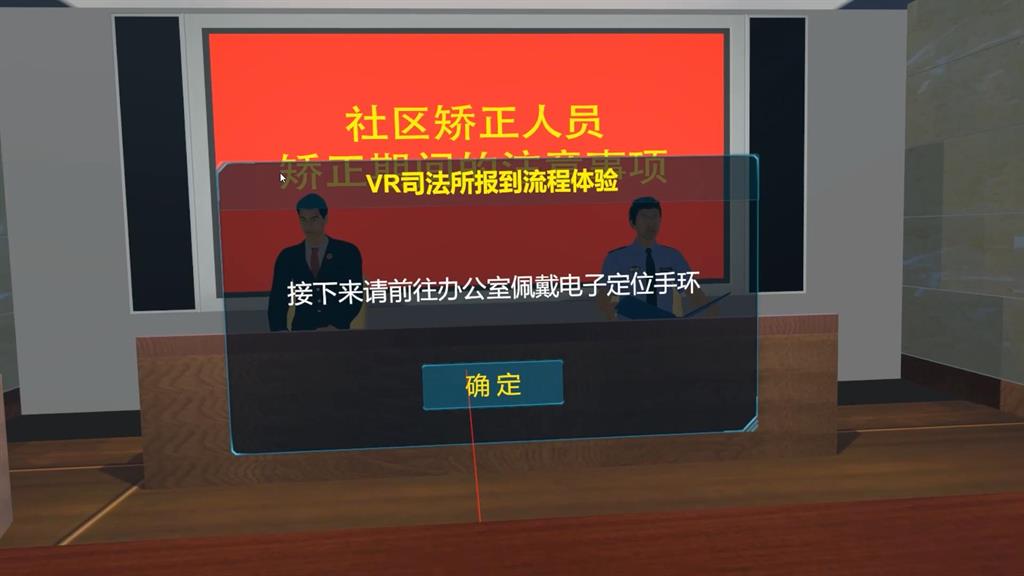模擬整個司法報到和辦理社區(qū)矯正等流程,體驗者以第一視角攜帶相關證明到司法所完成相應的報到程序,包括進入司法所、填寫信息、做心理健康測試、宣讀矯正規(guī)定、佩戴電子手環(huán)等。