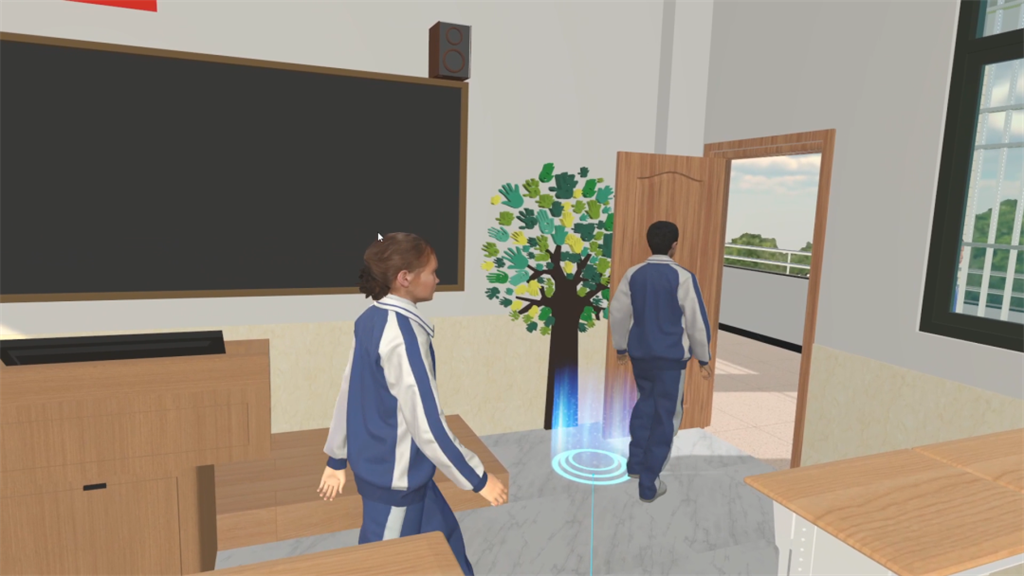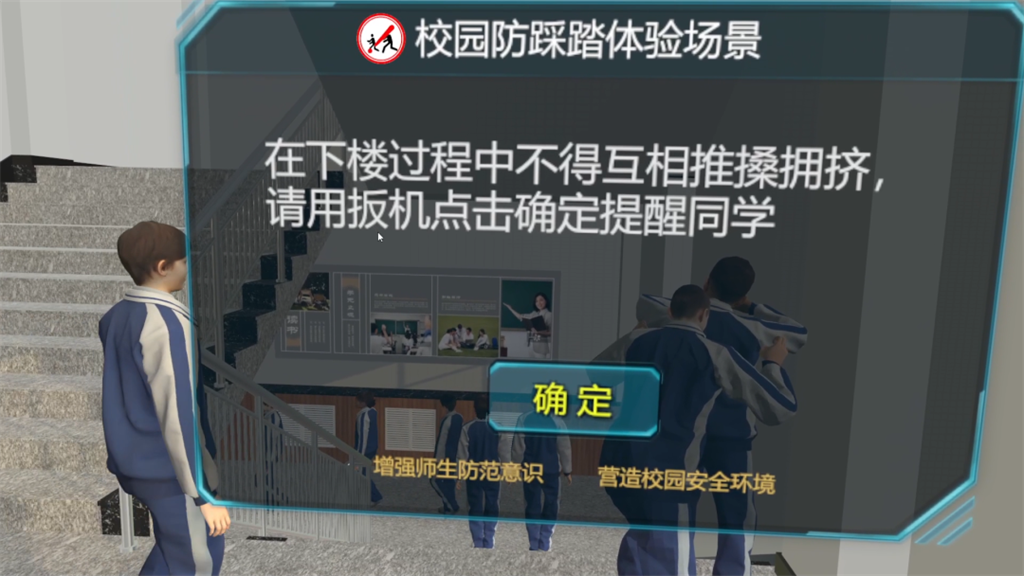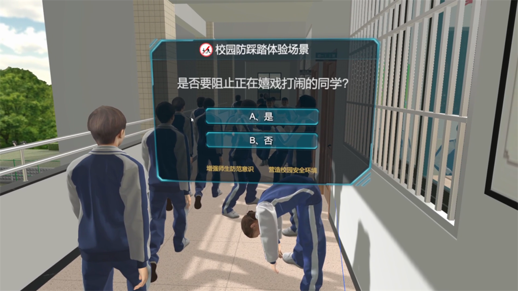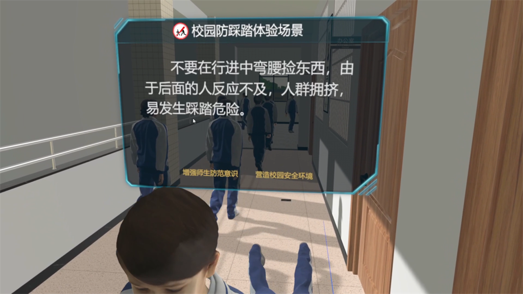 校園VR防踩踏體驗場景軟件從學校日常的早操入手,更具真實感與代入感;在校園早操準備過程中,學生們需集體前往操場,期間有同學在彎腰系帶、樓道走廊內(nèi)亂竄打鬧、人群擁擠處彎腰下蹲撿東西、在人流處逆向跑步、在下樓樓梯時互相推操擁擠、在下樓樓梯發(fā)生意外跌倒后,后面未知的人群依然涌動前行的狀況。