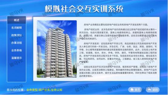 模擬社會交互實訓(xùn)系統(tǒng)具備6種模擬業(yè)務(wù)辦理知識,涵蓋民政、房產(chǎn)、公證、工商、司法所及派出所等關(guān)鍵社會服務(wù)領(lǐng)域,每個模塊均細分為5個子部分,分別是繪聲繪影、業(yè)務(wù)認知、法律講堂、隨堂測驗、聯(lián)系直通車,旨在通過多角度、多層次的交互體驗,深化服刑人員對每一個業(yè)務(wù)流程的理解和掌握。