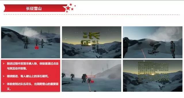 工作人員戴上VR眼鏡,可以重溫長(zhǎng)征路,體驗(yàn)當(dāng)年農(nóng)軍爬雪山的艱難。在雪山體驗(yàn)場(chǎng)景里,你將扮演一名紅軍戰(zhàn)士,在行進(jìn)過程中遇見戰(zhàn)友滑到,遇見體力不支餓暈在路旁的同志,還會(huì)遇見教科書本上為了革命而犧牲的軍需處長(zhǎng)。這些原本在教課書上發(fā)生的故事情節(jié),通過VR我們蹦栩栩如生在眼前展示。